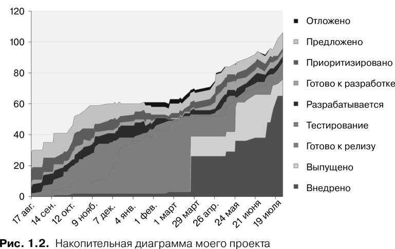 График на рис. 1.2 — это моя накопительная диаграмма потока (cumulative flow diagram — CFD). Я сделал ее следующим образом: