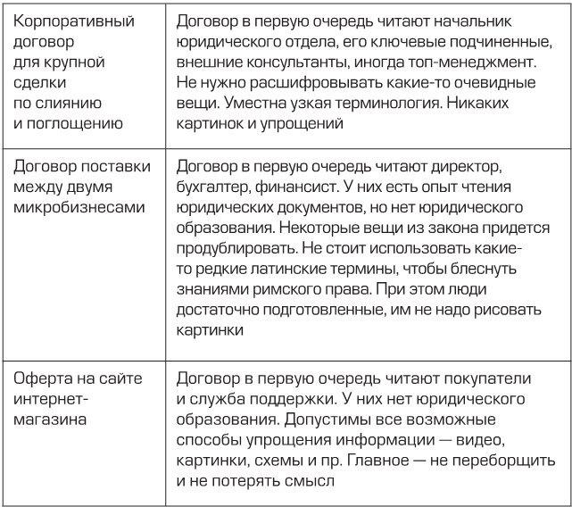Посмотрим, как будет меняться подход к договору в зависимости от уровня знаний и подготовки целевого читателя. Перед вами таблица с разными видами договоров, которые ориентированы на разного целевого читателя.