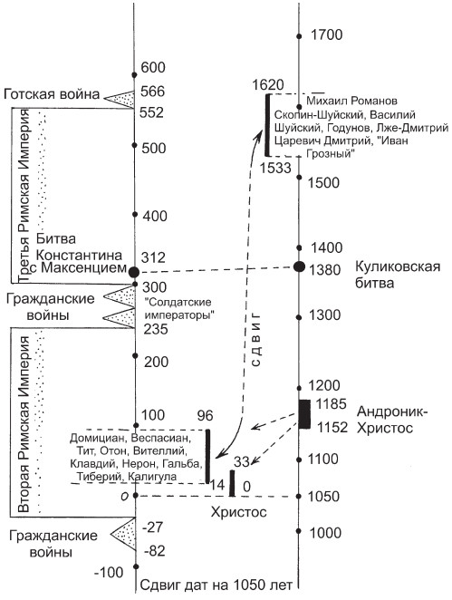 Рис. 1.1. Общая схема открытого нами параллелизма между «античной» римской историей якобы I века и историей Руси-Орды XVI – начала XVII века. К сдвигу на 1050 лет здесь добавился еще один сдвиг примерно на четыреста пятьдесят лет.