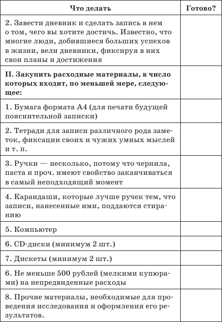 Вернемся к перечню в таблице. Экономисты утверждают, что после составления бизнес-плана все указанные в нем расходы для получения реальной картины событий следует умножить на 2. Мы не экономисты, но можем посоветовать то же самое, применительно к описанному набору необходимых средств. Вы не экономисты, поэтому купленные лишние листы бумаги, диски, дискеты, ручки и тетради никуда не пропадут, и в случае, если они вам не потребуются в этот раз, вы можете отложить их до времен написания следующей научной работы.