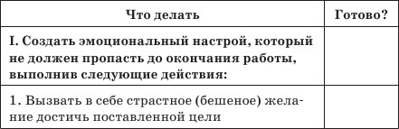 Заключительным шагом к созданию должного эмоционального настроя является разложение запланированного масштабного действия на ряд этапов, которые лучше зафиксировать – на бумаге или в виде текстового файла. Давно известно, что чрезмерная нагрузка способна измотать любого человека, в том числе и самого одаренного, поэтому не думайте, что вы – великое исключение. Что позволяет избежать перегрузок? Правильно, это план. Нет плана – есть перегрузки, есть план – все равно перегрузки присутствуют, но они предсказуемы, вы к ним готовитесь и, как следствие, вы не приведете себя к срыву.