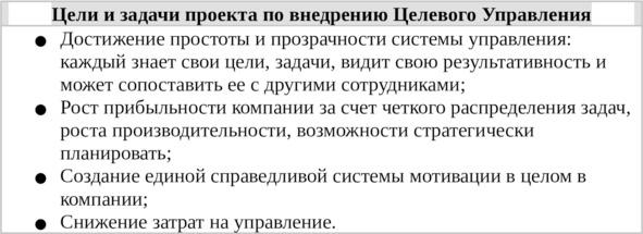 Когда я увидел идеологию системы управления по целям, меня это очень заинтересовало, потому что в идеологии Александра Литягина присутствует сразу несколько направлений, совмещенных в одно. Это система управления показателями KPI, система управления Smart-задачами и часть, которая относится к управлению качеством и оценки работы специалиста. Причем, это является некой «Морковкой» для сотрудников. Мы можем установить цель для специалиста, кроме того, он видит способ её достижения. Естественно, любая компания стремится повысить эффективность, повысить прибыльность на том, что мы имеем сейчас.