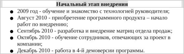 Первые ожидания были, что я получу какую-то методологию, какой-то готовый волшебный инструмент для работы в компании. Инструмент действительно существует, он волшебный, но с ним нужно уметь работать и нужно понять, как с ним будет работать компания — в каком контексте, в каком ключе. Обладая собственной базой, написанной на 1С, мы понимали, что многие вещи уже реализованы в нашей учетной системе и они пересекаются с теми или иными моделями работы, с функциями, которые есть в системе КPI-Drive. В таблице можете увидеть этапы внедрения системы и какая работа проводилась (таб. 2).
