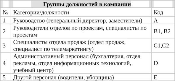 Группы должностей — это разбивка по иерархии руководства и руководителей отделов проектов, очень часто у нас это просто совпадает. Есть проектное управление, которое, конечно же, пересекается как матрица с функциональной схемой управления. Специалисты по отделам (отдел по разработке, внедрению, продажам, телемаркетингу, вспомогательные подразделения, отдел по рекламе, бухгалтерия, IT-отдел, учебный центр (группа D) и вспомогательный персонал (водители, уборщицы). Все у нас существуют в компании. Мы разбили на такие уровни и занимаемся сейчас внедрением. Провели обучение специалистов.
