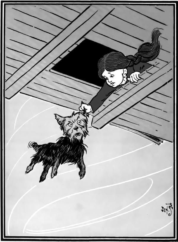 Однажды Тотошка зазевался и угодил в открытый люк. Сперва Дороти решила, что он пропал навсегда. Но потом увидела, что из люка торчит краешек чёрного уха. Давление воздуха не позволяло пёсику упасть на землю. Дороти подползла к люку, схватила Тотошку за ухо и втащила обратно. Затем она захлопнула люк, чтобы такое не могло повториться.