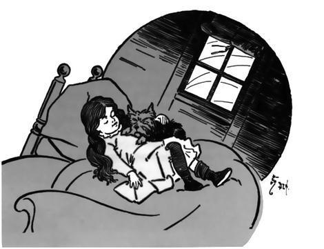 Дороти проснулась от толчка столь сильного и внезапного, что, не лежи она на мягкой постели, сильно ушиблась бы. Девочка быстро взяла себя в руки и стала думать, что же произошло. Тотошка уткнулся ей в лицо холодным носиком и заскулил. Дороти села в кровати и о