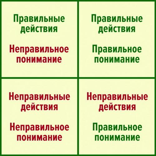 2) Мы можем что-то делать неправильно, руководствуясь правильным, верным мотивом (об этом как раз говорится «хотели как лучше, а получилось…»)