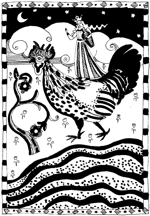 Cabalga sobre el gallo y va a la orilla del mar y dice: