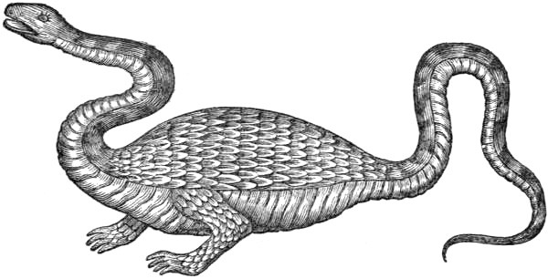 The creature seen in the Straits of Malacca, and one quoted by Mr. Newman, in the Zoologist, exhibit characters which confirm Egede’s story. In the latter instance, “Captain the Hon. George Hope states that, when in H.M.S. Fly, in the Gulf of California, the sea being perfectly calm and transparent, he saw at the moment a large marine animal, with the head and general figure of an alligator, except that the neck was much longer, and that instead of legs the creature had four large flappers, somewhat like those of turtles, the anterior pair being larger than those of the posterior. The creature was distinctly visible, and all its movements could be observed with ease. It appeared to be pursuing its prey at the bottom of the sea. Its movements were somewhat serpentine, and an appearance of annulations or ring-like divisions of the body were distinctly perceptible.” Mr. Gosse, commenting on this story, says: “Now, unless this officer was egregiously deceived, he saw an animal which could have been no other than an Enaliosaur, a marine reptile of large size, of sauroid figure, with turtle-like paddles.”
