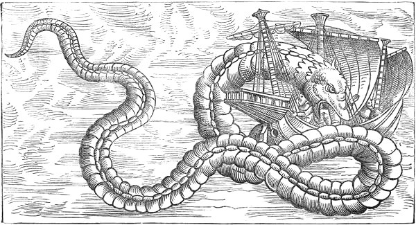 “It was a frightful sea-serpent, which we in our great simplicity took for a large lamprey or eel. This animal seemed to us very extraordinary, for it had fins, and we knew not that there were any such creatures as sea-serpents. Moreover, we had been so accustomed to discover creatures that were new to us, both at land and at sea, that we did not think this to be any other than an odd sort of eel that we never had seen before, yet which we could not but think more resembled a snake than an eel. In a word, the monster had a serpent or crocodile’s head, and a mouth full of hooked, long and sharp teeth.... When our purveyors came we related to them what had happened to us, and showed them the eel’s head, but they only said they had never seen the like.”