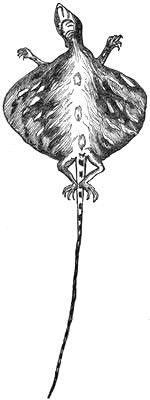 “It only inhabits the bottom of the sea. Its body decreases gradually backwards till it finishes in a string-like tail. The organs for breathing are not much developed. Six slits (gill apertures?) allow the water to enter.