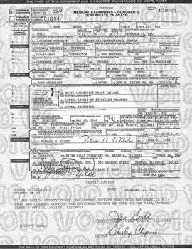 Свидетельство о смерти Джона Гейси. Он до конца отрицал свою вину. Его последними словами были: «Поцелуйте меня в зад»