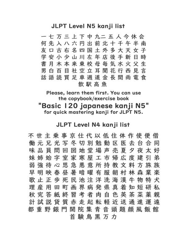 This book is intended for the study of basic kanji. Knowledge of these kanji will allow you to pass Nihongo Noryoku Shiken N4 Japanese language proficiency exam (JLPT N4). Before using this book, you need to learn the Japanese hiragana and katakana alphabets. Japanese kanji have two types of reading: Japanese (kun’yomi, spelled hiragana) and Chinese (on’yomi, spelled katakana). Knowledge of alphabets is necessary for understanding the reading of words and kanji.