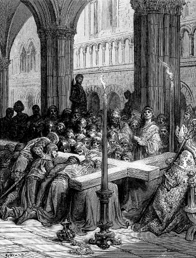 Так по всей стране люди готовились к паломничеству. Увы! Великая беда приключилась к следующему Великому посту, когда они уже были готовы отправиться в путь. Слег граф Жоффруа дю Перш и составил завещание, распорядившись, чтобы его брат Этьен взял его деньги и возглавил бы его людей. (Не будь на то Божьей воли, пилигримы охотно обошлись бы и без этих перемен.) Так скончался граф дю Перш. Это действительно было великой утратой – ведь он был весьма знатным бароном, воистину почитаемым и отважным рыцарем. Во всех его владениях подданные глубоко скорбели по нему.