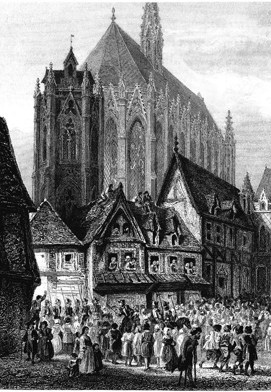 В этот день на Гревской площади зажигались потешные огни, у Бракской часовни происходила церемония посадки майского деревца, в здании Дворца правосудия давалась мистерия. Об этом еще накануне возвестили при звуках труб на всех перекрестках глашатаи господина парижского прево, разодетые в щегольские полукафтанья из лилового камлота с большими белыми крестами на груди.