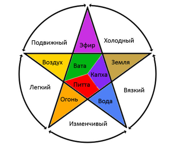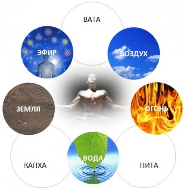 Представление о теле в Аюрведе это скорее представление об энергиях, праэлементах и их сочетаниях. Различается пять основных элементов. Воздух, вода, земля, огонь, эфир. Они не принимаются буквально, а широко, по основным качествам, в символическом значении. Так водой может быть не только вода а любая жидкость. Тогда воздухом может быть пар.