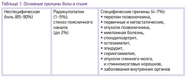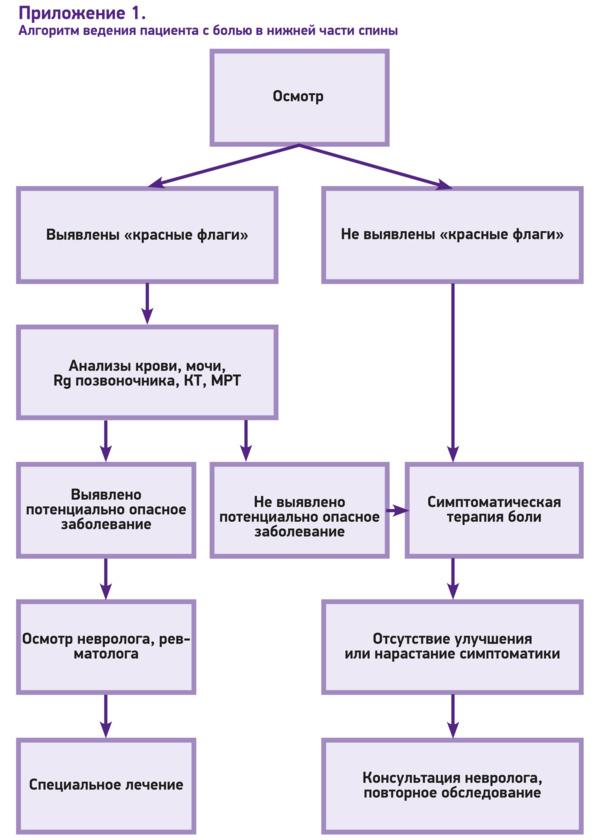 При этом ведущее значение имеет исключение специфической причины боли, при наличии которой необходимо экстренное направление к специалисту (неврологу, травматологу, ревматологу и др.). Ведение пациентов с неспецифической болью в спине и дискогенной радикулопатией во многом сходно, поэтому их разделение не столь значимо в амбулаторной практике.