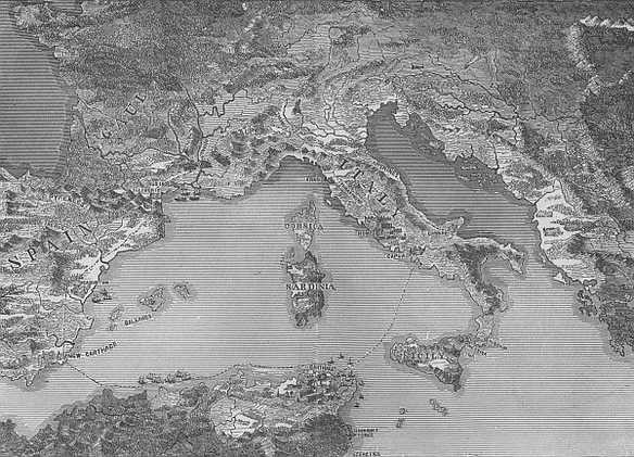 Let the reader now turn to the map and find the place of Carthage upon it. Let him imagine a great and rich city there, with piers, and docks, and extensive warehouses for the commerce, and temples, and public edifices of splendid architecture, for the religious and civil service of the state, and elegant mansions and palaces for the wealthy aristocracy, and walls and towers for the defense of the whole. Let him then imagine a back country, extending for some hundred miles into the interior of Africa, fertile and highly cultivated, producing great stores of corn, and wine, and rich fruits of every description. Let him then look at the islands of Sicily, of Corsica, and Sardinia, and the Baleares, and conceive of them as rich and prosperous countries, and all under the Carthaginian rule. Look, also, at the coast of Spain; see, in imagination, the city of Carthagena, with its fortifications, and its army, and the gold and silver mines, with thousands and thousands of slaves toiling in them. Imagine fleets of ships going continually along the shores of the Mediterranean, from country to country, cruising back and forth to Tyre, to Cyprus, to Egypt, to Sicily, to Spain, carrying corn, and flax, and purple dyes, and spices, and perfumes, and precious stones, and ropes and sails for ships, and gold and silver, and then periodically returning to Carthage, to add the profits they had made to the vast treasures of wealth already accumulated there. Let the reader imagine all this with the map before him, so as to have a distinct conception of the geographical relations of the localities, and he will have a pretty correct idea of the Carthaginian power at the time it commenced its dreadful conflicts with Rome.