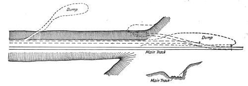 Ordinarily the spreading is done by the last train before the close of the day. In cold weather or on short dumps it must be done oftener; either to prevent freezing, or to make room for the unloading material which would otherwise pile up too high for easy spreading, or be liable to roll back on the track and obstruct it for the next train. In using the spreader it is coupled to the rear of the car carrying the plow, and after the train has been unloaded it is pulled over the length of the ridge of material unloaded from its own and preceding trains, as shown in Figs. 97 and 98.