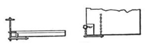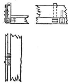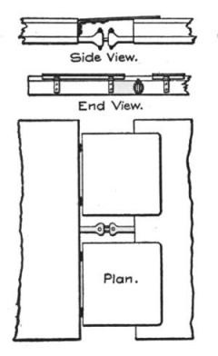 On all but very small pieces of work the cars should be provided with hinged drop sideboards, Fig. 79, using either of the arrangements shown in Figs. 80 and 81, which will enable them to carry 12 to 14 cu. yds. instead of 6 or 7. The side boards are made in two pieces on each side of the car, Fig. 79. Those shown in Fig. 80 are used for both center and side plows; they can be quickly dropped by a man walking along the train, after arriving at the unloading place and striking the hook A an upward blow with a light hammer. The boards are hooked up again after the cars have been returned to the steam shovel pit. The side boards shown in Fig. 81 are used where the side plow only is used. Here the board on one side only (the unloading side) is hinged (or chained), and dropped by pulling out the pin B, thus leaving that side of the car entirely unobstructed for unloading the material; the board on the other side of the car is bolted to the stake pocket and is not moved.