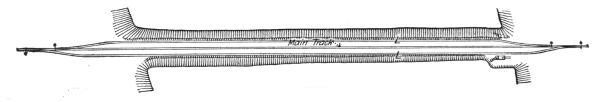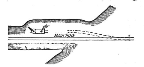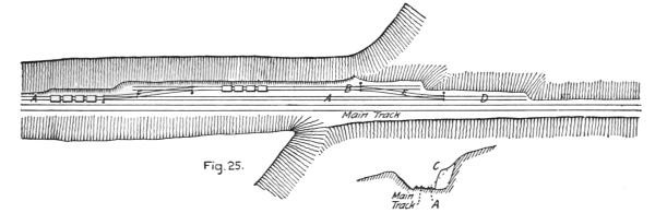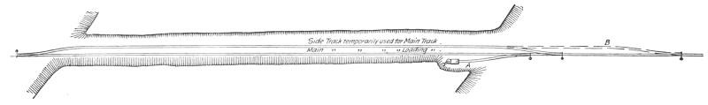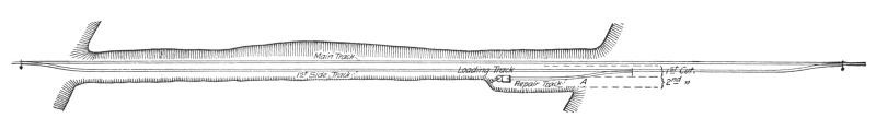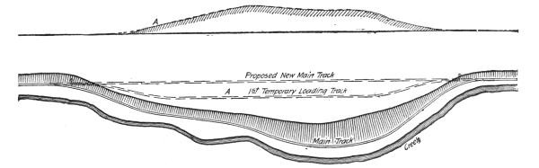 Where the embankment has been previously widened by the excavated material from the cut, Fig. 27, a sufficient length to permit laying a side track long enough to hold the construction train, the full number of cars can be used at once, a great advantage in keeping the steam shovel at work without interruption by passing trains, which is unavoidable when some of the cars extend out on the main track.