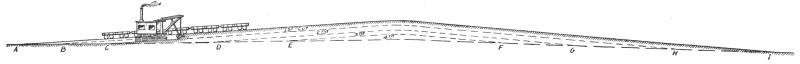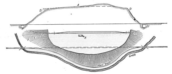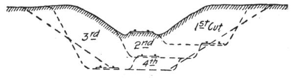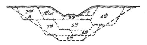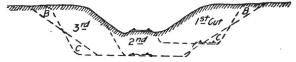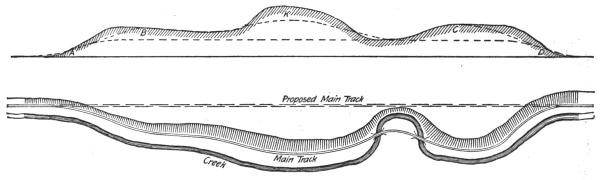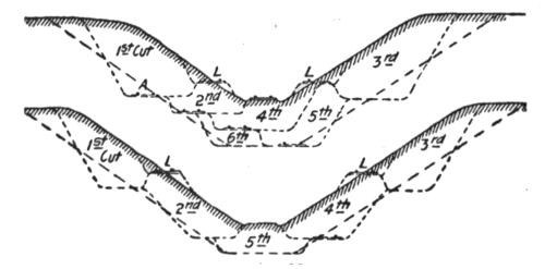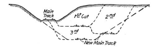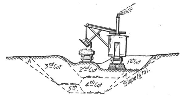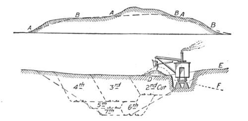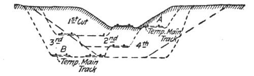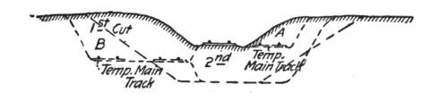 Construction Work.—On railways the steam shovel is used mostly in connection with maintenance of way work: loading gravel for ballasting the track, widening cuts, filling trestles, etc., but it is also largely used for various construction work, particularly re-alinements of the main track for reducing grades and curvature. In excavation of this class, thorough cutting should be avoided if possible, for reasons which will be subsequently explained. The work is begun by laying a temporary track, A, Figs. 50, 51 and 52, over the surface of the ground if its natural grade is not too steep to permit operating construction trains over it. Grades up to 6 per cent. (316.8 ft. per mile) can be used. A mogul engine will draw six empty flats over such a grade, a sufficient number of cars to start the work for the short cuts near the summit. The cuts are then made as indicated in Fig. 52.