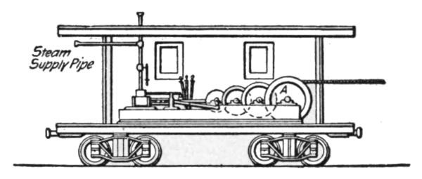 The machine shown in Fig. 92 has lately come into use for pulling the plow over the cars to unload them. This is merely a double cylinder (10 by 12 ins.) reversible hoisting engine, resting on a heavy cast iron bedplate attached to the floor of a box car. Steam is supplied to the engine from the locomotive of the train, which is coupled to this car when the unloading is to begin. With this machine there is no injurious jerking of the cable, and consequently very little breakages or delays, and heavy loads of 15 cu. yds. of tenacious material are readily plowed off the cars in a more satisfactory manner than can be done by any one or two locomotives. Blocking the wheels or chaining cars to the track need not be resorted to; the cars cannot move, for the machine pulls the plow toward itself and the strain is resisted by the cars between them. If it is desired to scatter small quantities of material along the track, as it is often wanted in surfacing or raising track, both plow and train are moved in the same direction at the same or varying speeds, as may be necessary to unload the required amount of material. If a large quantity of material is wanted within a short distance, as usually happens on washouts, train and plow are moved in opposite directions. By moving them in this manner at the same speed, a whole train can be unloaded at any desired spot. Where two locomotives must be used to pull the plow over the cars, the use of this machine will dispense with one of them, and do the work in half the time. On large jobs it should not be missing. The cable is wound around the drum, A, Fig. 92, and must be long enough to extend over the whole length of the train. A steel wire cable 1-1/8 ins. diameter is generally used; but for loose gravel a 1 in. cable is amply strong enough.