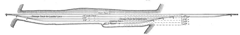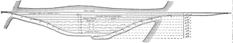After the completion of the fourth cut, Fig. 32, track No. 3 is used for a car repair and extra storage track for loads or empties, for which there may not be room in tracks 1 or 2. Enough tracks have then been built for the most efficient and economical handling of the loaded material, and if the empty cars are promptly returned the steam shovel can be kept almost constantly at work. Each pit track, on which the steam shovel advances, becomes a side track on the completion of that cut, to be used as a loading track for the next cut up to the fourth cut, after which the loading tracks are taken up on completion of the cut for which they are used, Fig. 33, and relaid in the pit of the next cut, to be used, taken up, and relaid as before for the following cuts. In pits less than one-quarter mile in length, it is sometimes necessary to retain more of these tracks to provide ample storage space for all loaded and empty cars.