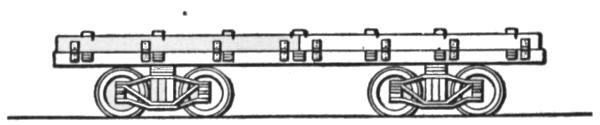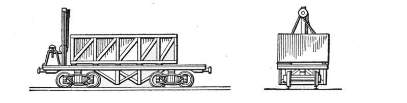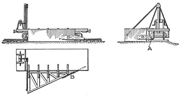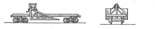 The first machines built were of the second type. As now constructed they are mounted on a wide wooden frame or car body, supported by four small wheels of 7 ft. to 8 ft. gage, thus placing the machinery close to the ground, with a wide base of support. In transporting this machine from one place to another, not on the line of a railway, it is necessary to take it apart, forward the sections and put them together again at the site of the new work. The machine is built with a view to rapid dismantling and re-erection, and for work requiring a large machine for economical excavation, located in hilly country not yet made accessible by rail, or requiring transportation by boat, it is the machine most generally used. Its ready adaptability to all kinds of work in any location has made it the favorite machine with many general contractors whose work includes large contracts for railway and other excavation. For transportation by rail this machine is run onto an ordinary flat car, only the crane being detached and loaded on a separate car. With this manner of shipment the machine can be made ready for railway work very quickly, but for exclusive railway work a machine of a later design has come into use and is now generally preferred for this class of work.