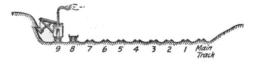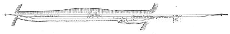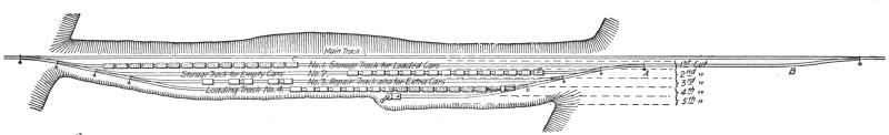The latter plan has the great disadvantage that only one car at a time can be loaded and only a few men (six to ten) can be employed. Therefore this plan is never adopted where quick work is required, but is used only where ample time is available, and mostly as an early spring preliminary job, preparing the way for the operation of the steam shovel later in the season. From three to six flat or coal cars are used, enough to require a whole day for the gang of men employed to load; the material from the face of the excavation is loaded on wheelbarrows, and wheeled over the empty cars to the one farthest from the cut. This car is loaded first, then the one next to it, etc. At night the loaded cars are taken out of the switch by the first available freight train and hauled to the nearest yard or side track where widening of the embankment is wanted, or where the material can be otherwise used to advantage, and there unloaded by a small gang of men on the following day; the cars to be returned again the next night. Other empty cars are placed in the pit track for loading next day, by a train bound toward the pit the same night the loaded cars were taken out. The work can be carried on from either one or both ends of the cut. Coal cars should never be used if flats can possibly be obtained, as the latter can be unloaded by a gang of men one-third as large as would be necessary for unloading coal cars.
