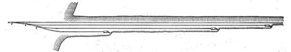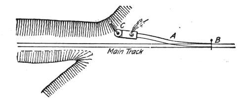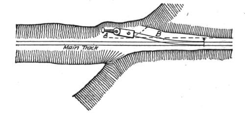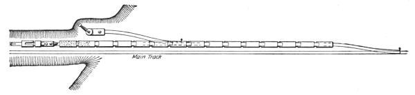 When the machine has reached the end of the switch, it advances on short sections of track, generally 4 ft. long, which are placed in front of it, and again taken from its rear when it has moved forward one section of track more than its own length. When no more cuts are to be made for still further widening, the switch is taken up again and the machine advances on its own track sections, Fig. 21. When other cuts are to follow, however, a loading track is needed for the next cut; the side track is then extended for this purpose at convenient intervals, generally about 300 ft. at a time though often after each space of a rail length (usually 30 ft.) is clear. The latter is by far the best practice, as it permits the immediate withdrawal of the machine in case of a threatened cave-in, sidehill slip, or other unforeseen danger.
