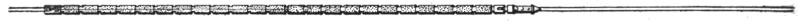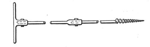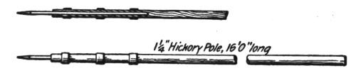With this crew dry sand and loose gravel can readily be loaded. In harder or more tenacious materials from two to six extra men are required, depending upon the kind of material to be excavated, and also upon good management of the contractor or foreman in charge. Wet sand and fairly loose gravel requires only two extra men, whose duty is to break down the overhanging ledges of these materials which cannot be reached by the dipper, and are liable to fall when the machine has advanced, burying it or blocking the pit behind it. The implement used by these men is a pole, Fig. 17, headed by an iron point, resembling a surveyor's pole. With these poles fairly loose gravel and sand can be readily broken down, sloped at its natural angle, and fed into the pit in front of the steam shovel. In harder materials three to four extra men are usually sufficient, but in very hard or tenacious materials as many as six must be employed. These men break down overhanging material in the face of the bank which cannot be reached by the dipper, bore or drill holes for powder or dynamite when blasting becomes necessary, cut and remove trees, etc.