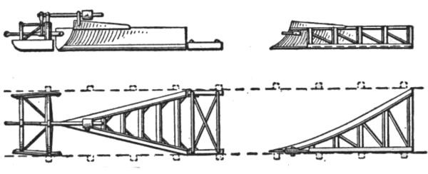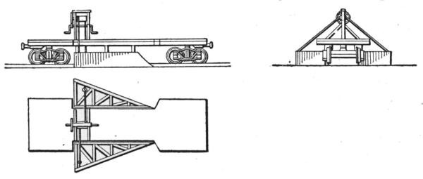The plow, Fig. 70, is built of heavy plate and angle iron, strongly braced, and headed by a cast steel point, to which the cable is attached. The sides are curved outward at the bottom, working under the material and pushing it aside as the plow is drawn along, and held down on the car by the weight of the material and the partly downward pull of the cable at its point. Short pieces of old rails and other scrap iron are also often placed on the plow to help hold it down on the car when very tenacious materials are to be unloaded. The groove extending along the center line on the bottom fits over the ridge timber on the car, and forms the guide by which its movement is directed. Small stones, protruding bolts, slivered ridge timbers and other obstructions in the groove of the plow sometimes wedge the point fast, and before the engine can be stopped, the plow is turned up on its point, and falling to either side, tumbles off the car. The weight and elasticity of the cable is often sufficient to draw the plow half a car-length after the engine has been stopped, and it is often difficult to stop the plow quick enough to prevent upsetting when obstructions occur, although the speed is usually only two to three miles per hour. The unloading nearly always occurs on trestles or embankments, and when the plow is thrown off the car, its replacement often requires much time and labor, sometimes even making the services of the wrecking car necessary. This difficulty is very likely to occur when unloading on curves, where one side of the point of the groove presses against the ridge timber. This plow unloads the material equally on both sides of the car, as it is wanted in filling trestles, raising embankments, tracks, etc.; but it cannot be used to advantage where the material is wanted on one side only, as in widening embankments for double track, side tracks, yards, station grounds, etc.