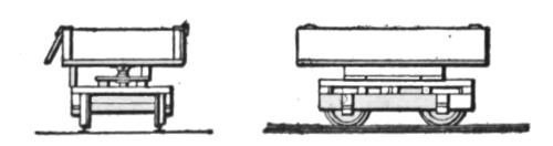 Standard gage railway dump cars, Figs. 66 and 67, have nearly gone out of use. They were replaced by the center ridge flat car, Figs. 68 and 69, and it in turn has been replaced by the ordinary flat car. Dump cars are of two styles, dumping either by tipping, Fig. 66, or by means of a hinged sideboard opening on an inclined floor, Fig. 67. Both are heavy, clumsy, costly and can be used for scarcely any other purpose, often standing idle from six to eight months of the year. They dump dry materials very rapidly, but are often slow in discharging damp, tenacious materials, especially in the hinged sideboard car, whose floor slope is often not sufficient to permit the material to slip out quickly, and the material must then be pushed out, thus causing much delay. The greatest objection to these cars is that they can be used for scarcely any other purpose, on most railways for no other purpose; and there is not sufficient work for them to justify keeping the necessary number on hand for the ordinary work in this line. They were replaced by the center ridge car, Figs. 68 and 69, as above noted, which is merely an ordinary flat car with a timber 4 by 6 ins. bolted on its floor along the center line, serving as a guide for a plow, Fig. 70, drawn over it by the locomotive, thereby unloading the material. The ridge timber is slightly pointed at both ends to assist in guiding the plow onto the car as it passes from one car to another. The top edges of the ridge are sometimes protected by angle irons, as in Fig. 71, and the points by cast iron caps, Fig. 72. By taking off the center ridge this car can readily be restored to general service after completing the steam shovel work. The center dump car, shown in Fig. 73, is used only for gravel ballasting where the material is wanted delivered between the rails.