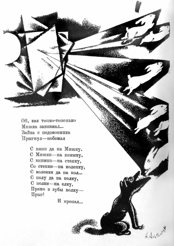 Еще одна книжка группы «Сегодня» представляет собой подлинно артельное явление — это издание стихов Натана Венгрова «Зверушки» с иллюстрациями Альтмана, Анненкова, Ермолаевой, Любавиной и Туровой (напечатана в Петрограде в 1921 году). Особо примечателен, пожалуй, рисунок Альтмана (на с. 12) к стихотворению «Про зайку солнечного» (ил. 3). Лучи от солнца в левом верхнем углу проходят через цепочку зеркальных призм; на концах лучей обнаруживаются изображения реальных зайцев. Динамическая игра ломаных плоскостей напоминает супрематические приемы построения формы, что в данном случае полностью оправдано предметным содержанием композиции — преломлением света. Любопытно заметить, что последний «зайка солнечный», проскакав по всем зеркалам, попадает в пасть волку в соответствии со стихами: «Прямо в зубы волку — прыг!.. и пропал». Довольно необычный для сказок финал с персонификацией солнечного отражения в виде натурального зайца с последующей его гибелью в волчьей пасти заслуживает того, чтобы немного задержаться на нем.