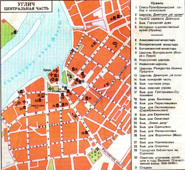 — Нет. Я же не случайно перелистывал энциклопедию «Города России». Здесь приводится довольно подробный план исторической части Углича. И что характерно, оказывается, царская семья — то есть царица Мария Нагая с сыном и братьями проживала в палатах, расположенных на полуострове.