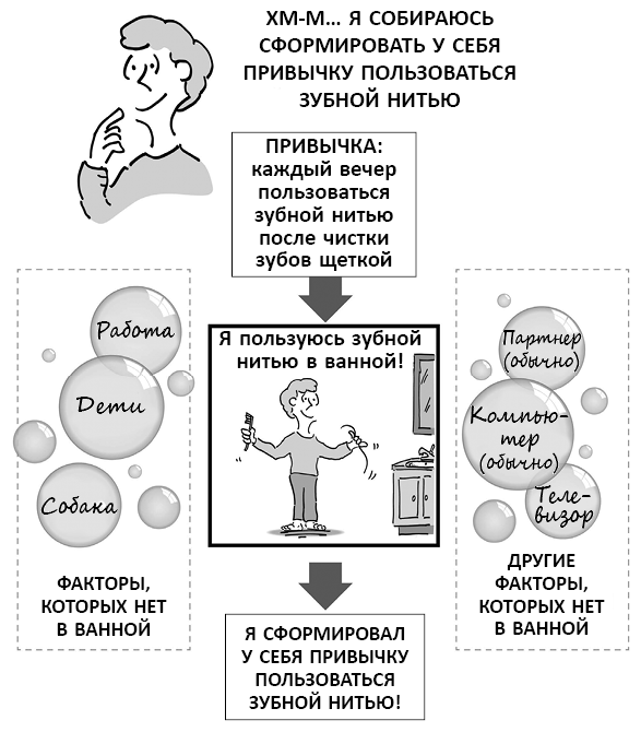 Как следует из иллюстрации, в отличие от простого действия, такого как использование зубной нити, модели поведения, определяющие наш стиль жизни, как правило, зависят от множества бытовых сложностей, связанных с рядом контекстов, людей и потребностей. Например, исследования показывают, что простое изменение обстоятельств (такое как перенос места проведения тренировок) может разрушить даже многолетнюю привычку к физическим упражнениям[14].