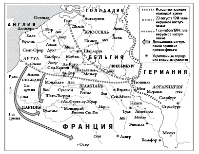 У французов тоже имелся план войны против Германии. Разрабатывать его начали в 80-х годах XIX столетия. В этот план неоднократно вносились изменения, и вариант XVII предполагал именно ту «любезность» немцам, возможность которой отвергал Шлифен, — наступление через франко-германскую границу в Лотарингию и в направлении Рейна. По мнению Шлифена, это в наименьшей степени соответствовало интересам самой Франции. Дело в том, что в 80-х годах XIX века не только Франция, но и Германия потратила очень много сил и средств, чтобы усовершенствовать фортификационные сооружения, защищавшие ее территорию. Провинции Эльзас и Лотарингия, вошедшие в состав новой германской империи в 1871 году, были хорошо укреплены Францией за два предшествующих столетия. Тем не менее по указанию имперского правительства Германии — теперь Эльзас и Лотарингия были территорией рейха и подчинялись Берлину — укрепления городов Мец и Тьонвиль на реке Мозель, а также Страсбурга на Рейне существенно обновили. Эти города служили воротами из Франции в Германию — французы недаром продолжали называть Страсбург Страсбуром. Шлифен не верил, что высшее военное командование Франции решится на такое безрассудство — атаковать их.