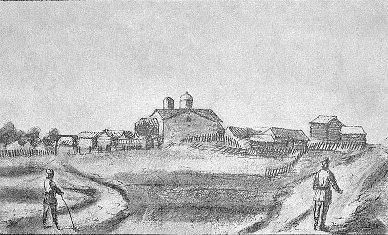 Вид русского села времен Алексея Михайловича. «Альбомъ Мейерберга. Виды и бытовыя картины Россiи XVII века»