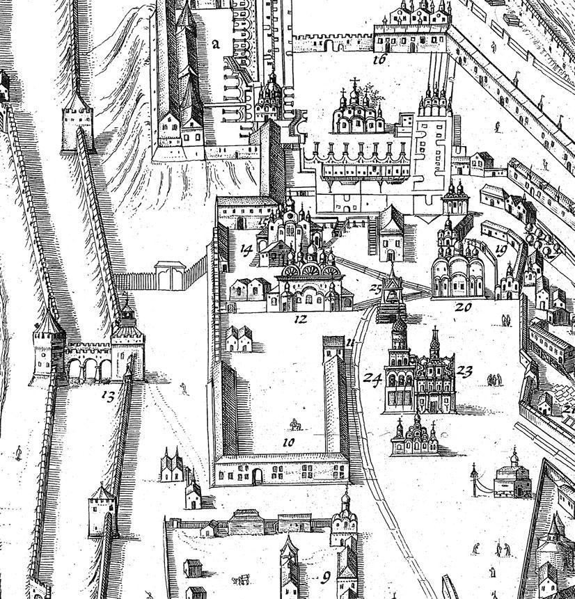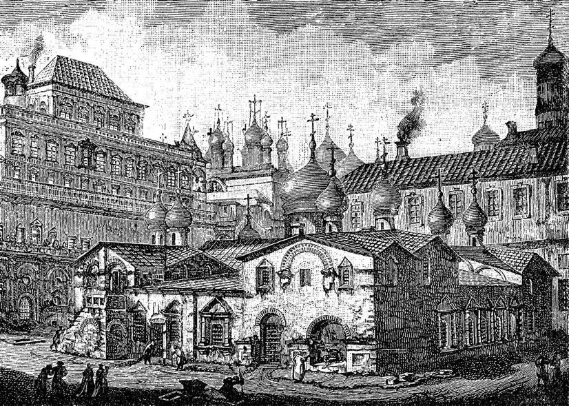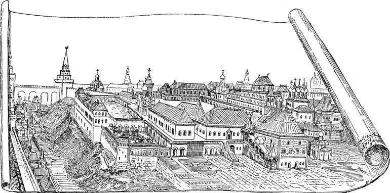 В Кремле находился двор государев. У старых великих князей хоромы были деревянные. Но по мере того как держава Московская принимала более крепости и государственной силы, возникала при дворе потребность созидать каменные здания. При Иоанне III построен был каменный казенный дворец между Архангельским и Благовещенским соборами, а потом и дворец для жилья, оконченный в 1508 году. Ужасный пожар в 1547 году повредил этот дворец. Иоанн возобновил его и украсил золоченой кровлей, но в 1571 году он был разорен Девлет-Гиреем. При Федоре он был, однако, уже отделан и находился в нарядном виде. При Борисе, Самозванце, Шуйском и в первую половину царствования Михаила строили только деревянные дворцы. Но после пожара 1626 года, во второй раз при Михаиле истребившего царское жилье, принялись за постройку каменных зданий. Михаил Федорович отстроил себе каменный дворец, но не жил в нем, а предоставил его царевичу и предпочел для себя жить в деревянном здании, находя, что деревянные здоровее каменных. При Алексее Михайловиче была построена новая дворцовая палата и потешный дворец. В конце его царствования существовало два царских каменных дворца. При Федоре Алексеевиче были перестроены и обновлены каменные здания дворца. Но тем не менее в XVII веке цари продолжали предпочитать деревянные здания для жилья и для каждого члена царского семейства строили особые домики. Таким образом, царские усадьбы в Кремле состояли из немногих каменных и множества деревянных строений, отдельно построенных, нагроможденных в различных направлениях и по вкусу времени испещренных золотом, разноцветными и вычурными украшениями. Царский двор огорожен был решеткой с воротами, на которых висели образа. Эти ворота назывались Курятные, Колымажные, украшенные высокой башней и часами, Воскресенские и Золотые, или Гербовые, с башней, на вершине которой находился золоченый двуглавый орел, а на стенах были изображены гербы областей Московского государства. Курятные ворота в 1658 году переименованы в Троицкие и находились на севере, без башни наверху, под палатами царских мастериц; за ними вне двора было множество зданий, занимаемых разными отраслями царского хозяйства; дворцы: сытный, кормовой, хлебенный, приспешные палаты, пивоварня, медоварня, воскобойня, свечная, аптека, денежный двор, конюшенный двор и прочее. На взгорье к Москве-реке был запасный дворец – каменное здание с разведенным на нем садом, а внизу житный двор (где хранились хлебные запасы) и церковь Благовещения. Кроме царского двора в Кремле были дворы приближенных к царю бояр и вельмож. Так, при Алексее Михайловиче там находились дворы: Морозова, Куденевича-Черкасского, Бориса Лыкова и других. Оригинальная неправильность постройки, вычурность, пестрота и затейливость украшений останавливали на себе взгляд путешественников, но более всего их поражали кремлевские церкви: купола и главы некоторых из них были покрыты золоченой медью и ослепительно блистали против солнца. В начале XVI века только немногие из них были каменные, но в XVII веке число их несравненно увеличилось. Всех вообще церквей насчитал Олеарий в Кремле 52, а другой путешественник при Алексее Михайловиче только 30. Верно только то, что их было больше, чем теперь, потому что кроме существующих упоминаются такие, которых более нет: Сретенский собор, Троицкий м