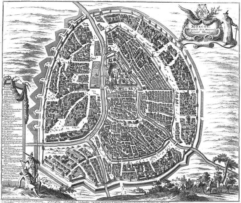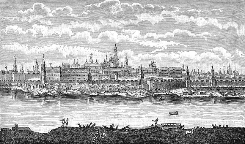Средоточием Москвы был Кремль. Неизвестен год его возведения. Вероятно, он существовал с основания самой Москвы и был, как вообще русские города, деревянным. В 1367 году впервые заложен был каменный город, но потом разрушился, и уже в конце XV века великий князь Иоанн построил опять каменную стену с башнями. Постройкой занимались итальянцы. От двух углов кремлевской ограды на восток тянулось продолжение каменной стены и образовывало другой город, называемый Китай-городом, построенный в 1538 году правительницей Еленой. За Кремлем и Китай-городом, примыкавшими с одной стороны к реке, с других сторон простирался посад, который также был обведен стеной с воротами и башнями и назывался Белым городом, от белого цвета окружавшей его стены. За этой стеной следовал другой посад, который также был при Борисе обведен двойной деревянной стеной с толстым слоем земли в промежутке между двумя стенными рядами. Он назывался Земляным городом. Сверх того, на другой стороне Москвы-реки как продолжение Земляного города стоял городок, и, наконец, многие монастыри, укрепленные по тогдашним обычаям стенами и башнями, представляли вид отдельных городов. Так, при Михаиле Федоровиче во время нашествия королевича Владислава монастыри Симонов и Новодевичий обращены были в отдельные форты.