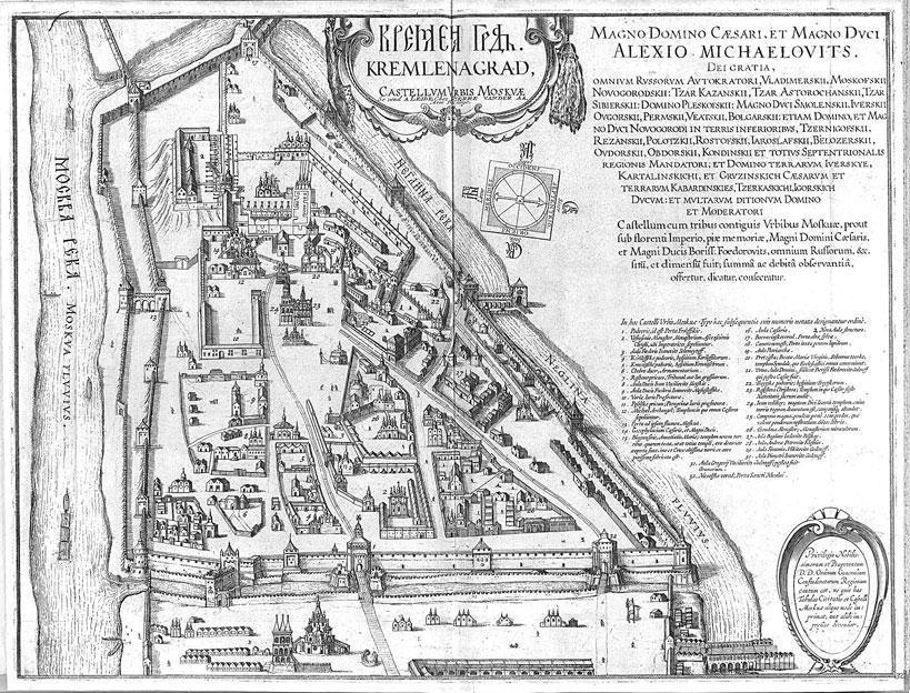Кремль занимал середину столицы и был средоточием власти, управления, церковного устройства и убеждений всего русского народа. Там жил царь, и Кремль был священным местом русского народа. С трех сторон Кремль окружен был водой; с юга окаймляла его Москва-река, с запада и с севера Неглинная. Эта болотистая река, теперь уже не существующая, в верхней части Кремля образовывала пруд, из которого была проведена вода в канавы, прорытые около кремлевских стен. В XVI веке канавы эти были так многоводны и глубоки, что на них построили мельницы. При Михаиле Федоровиче они стали просто рвами, однако значительной глубины. По направлению канав или рвов Кремль окружала кирпичная стена с башнями. Каждая из башен носила собственное название, одни по образам, которые на них висели, другие по местности. В XVI веке насчитывалось шестнадцать или семнадцать башен. Башни проезжие были громаднее, чем глухие. Ворота Кремля были следующие: Фроловские, в 1658 году переименованные в Спасские и теперь сохраняющие это название, Никольские, Константиновские (теперь не существующие) на юг от Спасских, Боровицкие, переименованные Алексеем Михайловичем в 1658 году в Предтеченские, Неглинные, Тайнинские к Москве-реке и Портомойные на юго-западном углу у водовзводной башни, куда прачки выходили мыть белье на плот, устроенный для этого. Только пять первых ворот были проезжими. Фроловская, или Спасская, башня над главными воротами была выше и красивее других. На рисунках, оставшихся от XVII века, она одна походит на нынешние кремлевские проезжие башни. Сверх всех башен, проезжих и глухих, на каждой стороне кремлевских стен были устроены маленькие башенки, где висели колокола, в которые звонили во время пожара и тревоги. Кремлевские стены были уставлены пушками.