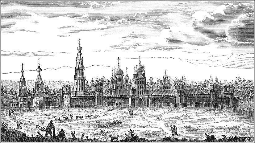 За пределами Кремля на восток тянулся Китай-город. Китай-город начинался от Кремля Красной площадью. Он был обведен кирпичной стеной красного цвета (побеленной при царевне Софье), которая на севере соединялась с углом кремлевской, а на юге вдоль Москвы-реки с белогородской и образовывала с ней одну стену. Тут было Лобное место, откуда читались народу царские грамоты; здесь стояла Покровская церковь, которую называли Иерусалимской, построенная царем Иваном Васильевичем после взятия Казани и теперь поражающая своей оригинальностью и причудливой смесью восточной архитектуры с европейской. Недалеко от нее был амфитеатр из тесаного камня, поднимавшийся вверх уступами, место значительное в старой обрядности нашей в праздник Вербного воскресенья. Близ амфитеатра стояла церковь Св. Меркурия Смоленского; с другой стороны амфитеатра находился Земский приказ – покрытое землей здание с двумя огромными орудиями наверху и с другими двумя внизу на земле. На Красной площади перед лицом Кремля был большой рынок, где постоянно толпились и продавцы, и покупатели, и празднолюбцы, а вблизи амфитеатра сидели женщины, продававшие свои изделия. На восток от рынка простирались торговые ряды; их было множество, потому что для каждого товара был свой торговый ряд. В Китай-городе находилась типография, множество церквей, многие приказы, дома знатных бояр, дворян и гостей, английский двор, по упразднении привилегии англичан обращенный в тюрьму, три гостиных двора; от последнего из них, персидского, на юг шла овощная улица, состоявшая из лавок с овощными товарами. Она упиралась в рыбный рынок, по рассказам иностранцев ставший известным своей нестерпимой вонью. От него через реку построен был мост на судах, а за мостом следовало козье болото, урочище, на котором казнили преступников.