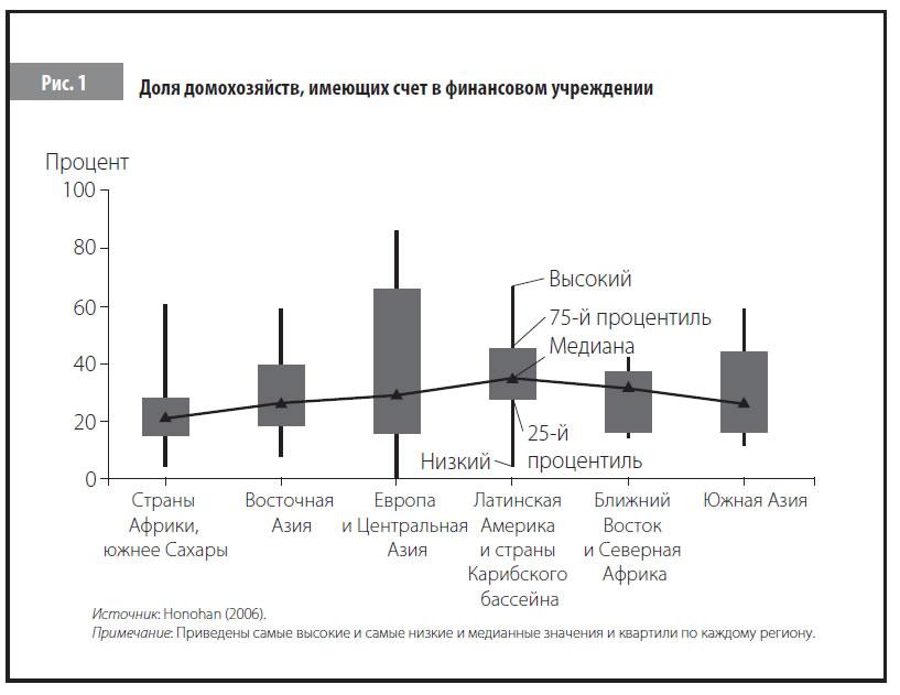 В отсутствие полных микроданных исследователи пытаются создать синтетические обобщенные индикаторы, сочетающие более доступные макроданные и результаты опросов. Эти обобщенные индикаторы показывают, что по всему миру домохозяйства имеют ограниченный доступ к финансовым услугам и пользованию ими: в большинстве развивающихся стран менее половины населения имеют счета в финансовых учреждениях, а во многих странах лишь пятая часть домохозяйств, если не меньше, прибегают к финансовым услугам (рис. 1).