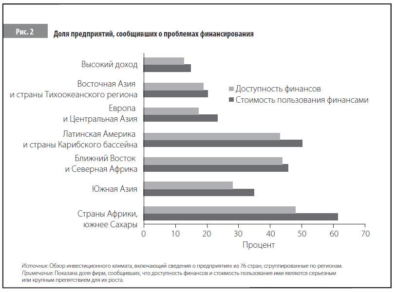 Сведения о доступности финансов для предприятий более многочисленны, хотя репрезентативность этих опросов вызывает сомнения, особенно это касается неформального сектора экономики (который во многих странах превышает официальный). Данные опросов показывают, что менее 20% малых предприятий пользуются внешним финансированием, тогда как среди крупных предприятий таких около половины. И по меньшей мере в трех регионах 40% владельцев бизнеса сообщили, что доступность финансов и стоимость пользования ими являются препятствием для роста их предприятий (рис. 2).