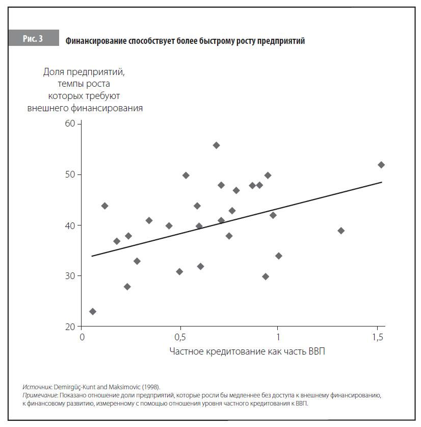 Сильная финансовая система сможет способствовать выходу на рынок новых фирм, их росту, внедрению инноваций, более оптимальным размерам предприятий и снижению рисков, и это неизбежно улучшит агрегированные экономические индикаторы. Однако изменения в финансировании не улучшают эти показатели равномерно, они скорее трансформируют структуру экономики, влияя на разные типы предприятий по-разному. На любом из уровней финансового развития меньшие по размеру предприятия сталкиваются с бóльшими трудностями при доступе к внешнему финансированию, чем крупные компании. Но с финансовым развитием и улучшением доступа к внешнему финансированию у таких предприятий появятся новые возможности. Исследования показывают, что предприятия малого бизнеса получают наибольшие преимущества от финансового развития — с точки зрения и возможности выхода на рынок — и более быстрого роста. Таким образом, создание всеохватывающего финансового сектора особо важно для структуры и характера конкуренции предпринимательского сектора.