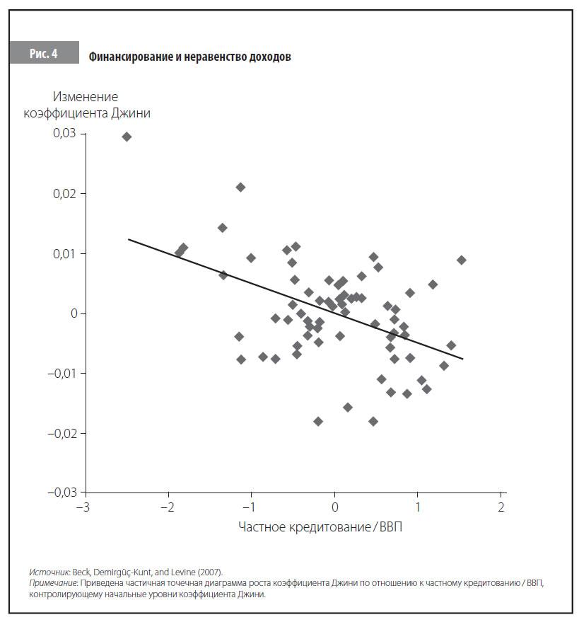 В долгосрочном плане экономический рост помогает сократить бедность и повысить благосостояние большинства домохозяйств. Исследования показывают, что улучшение доступа к финансам не только способствует росту, но и уменьшает неравенство доходов (рис. 4), что отвечает интересам малоимущих. Насколько важно с этой точки зрения прямое обеспечение финансовыми услугами бедных домохозяйств и малоимущих граждан? Согласно имеющимся данным, можно предположить, что косвенный эффект улучшения доступа к финансам через более эффективный рынок продуктов и труда окажет более серьезное воздействие на положение бедных слоев населения, чем прямой доступ к финансам.