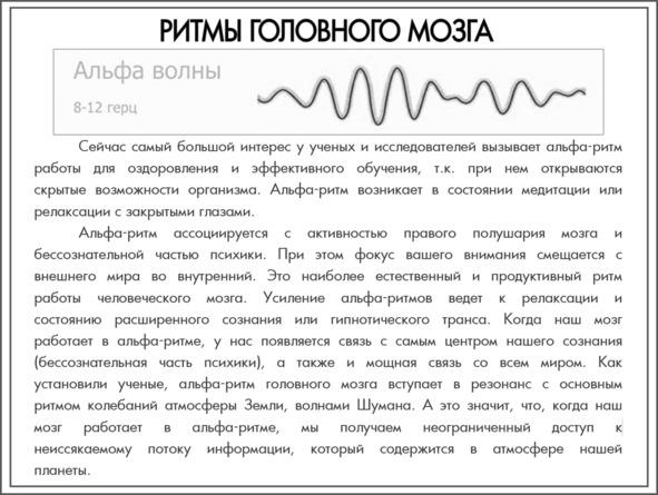 Вот именно в этом состоянии работают аутотренинги, закладываются установки, приходят инсайты, и вы чувствуете, как мягкая и нежная нега словно окутывает вас, наполняя своей безграничной энергией.