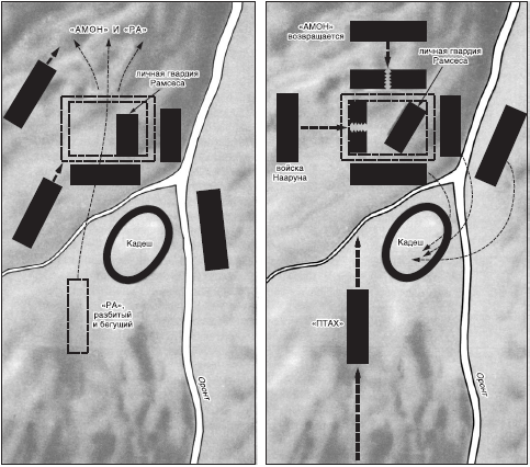 Когда Рамсес приблизился и, двигаясь в северном направлении, стал обходить Кадеш с запада, хеттская армия сначала двинулась через реку в восточном направлении, а затем к югу, так что город постоянно находился между ней и противником, избегая быть обнаруженной. В конечном счете они завершили блестящий маневр, отрезав Рамсеса с юго-востока. Египетская армия была разделена на две части. Рамсес оказался перед лицом превосходящих сил неприятеля. Остальные его отряды остались так далеко к югу, что было сомнительно, успеют ли они вступить в бой. Египетский царь осознал свое отчаянное положение, когда захватили двух хеттских шпионов – на этот раз настоящих, – которые признались, что хеттская армия находится за Кадешем.