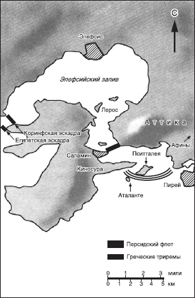 Греческий флот двинулся по проливу на юг и обогнул Аттику, теперь только он мог спасти Грецию. Задача состояла в том, чтобы склонить персидский флот принять бой в водах, устраивающих греков. Фемистокл решил, что такое место у острова Саламин, расположенного у входа в Элефсийский залив. К заливу можно подойти с запада или с востока. Восточный подход разделяется островом Пситталея на два очень узких пролива, каждый не более трех четвертей мили шириной. Большой персидский флот оказался бы зажатым в этих узких пространствах, и у опытных греческих мореходов открывались большие возможности. Однако теперь персы уже не нуждались в морском сражении. Предпочтут ли они пренебречь греческим флотом? Боевой дух греков был невысок, поскольку Ксеркс к тому времени опустошил Аттику и безжалостно расправился с защитниками афинского Акрополя. Эврибиад колебался. Но Фемистокл решился на очень смелый замысел, имевший целью соблазнить персов захватить греческий флот. Он оставил пролив между Саламином и Мегарой незащищенным и 22 сентября 480 г. до н. э. довел до сведения Ксеркса, что «греками овладел страх и они подумывают о поспешном бегстве».